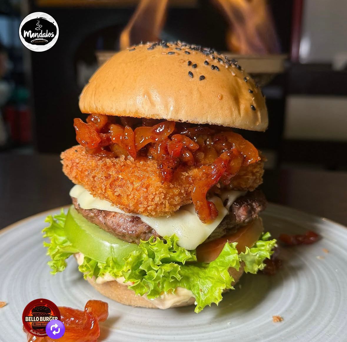 Pan sésamo, did de pimentón, 150 gr de carne 100% de res, lechuga, mix de tomates, queso mozzarella, crujiente queso philadelphia apanado, tocineta rustica en salsa de maracuyá dulce con reducción de whisky Jack Daniels honey.